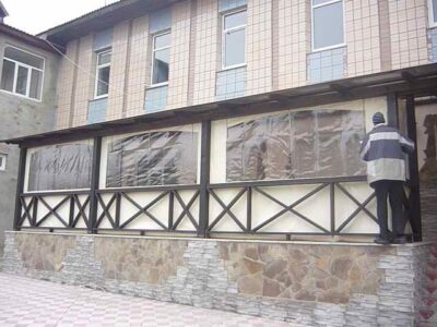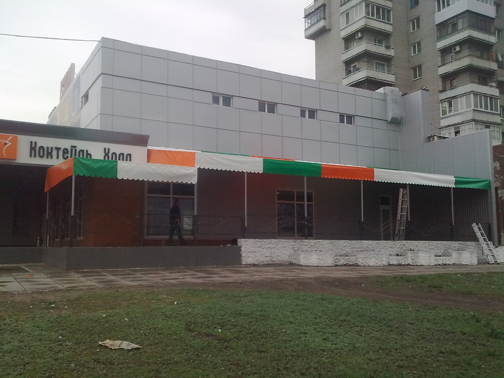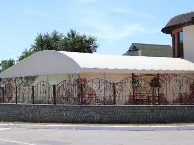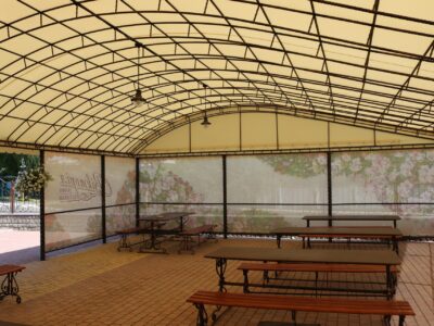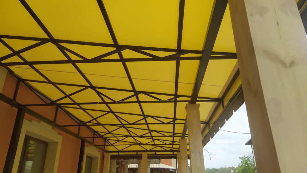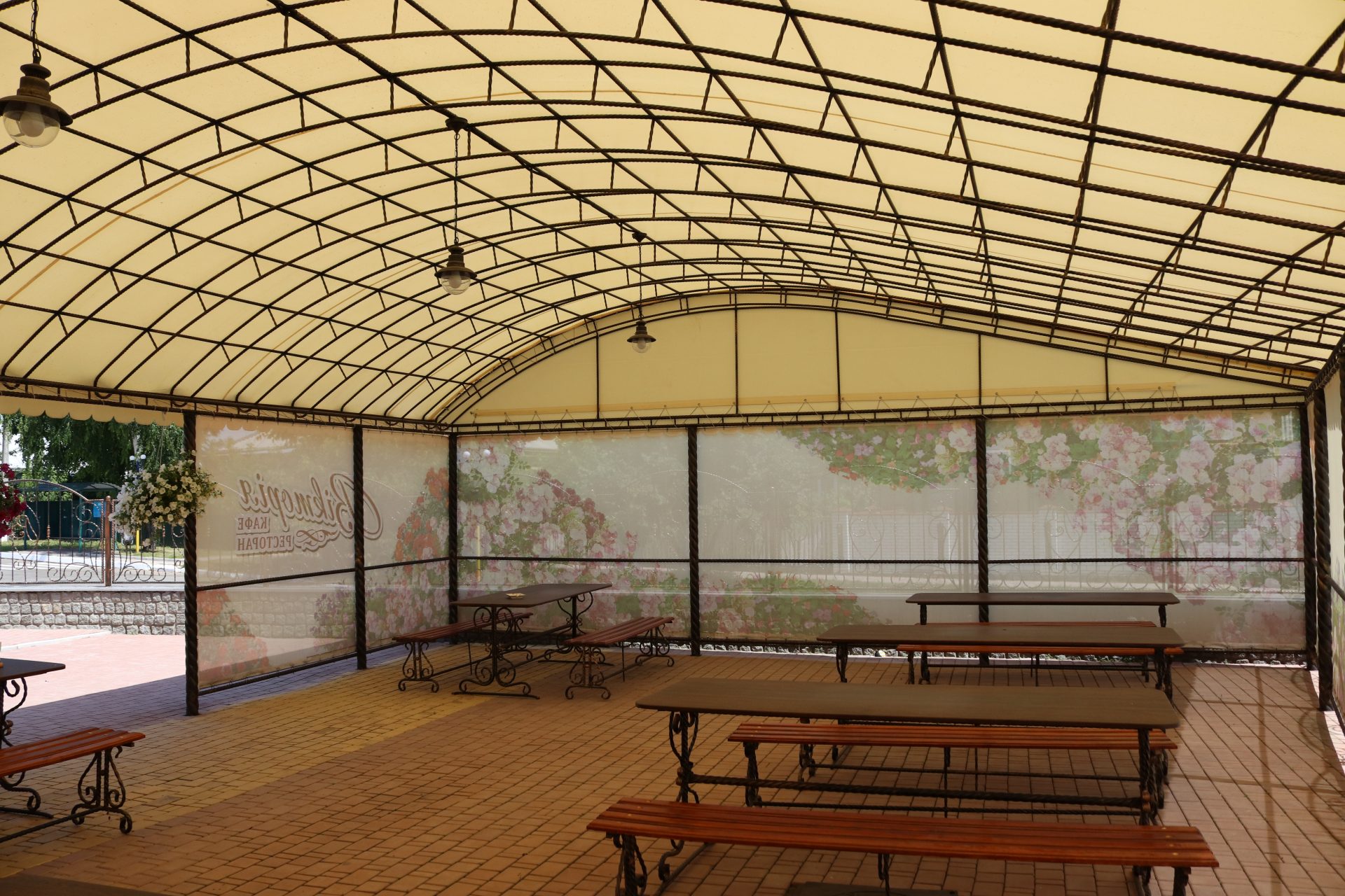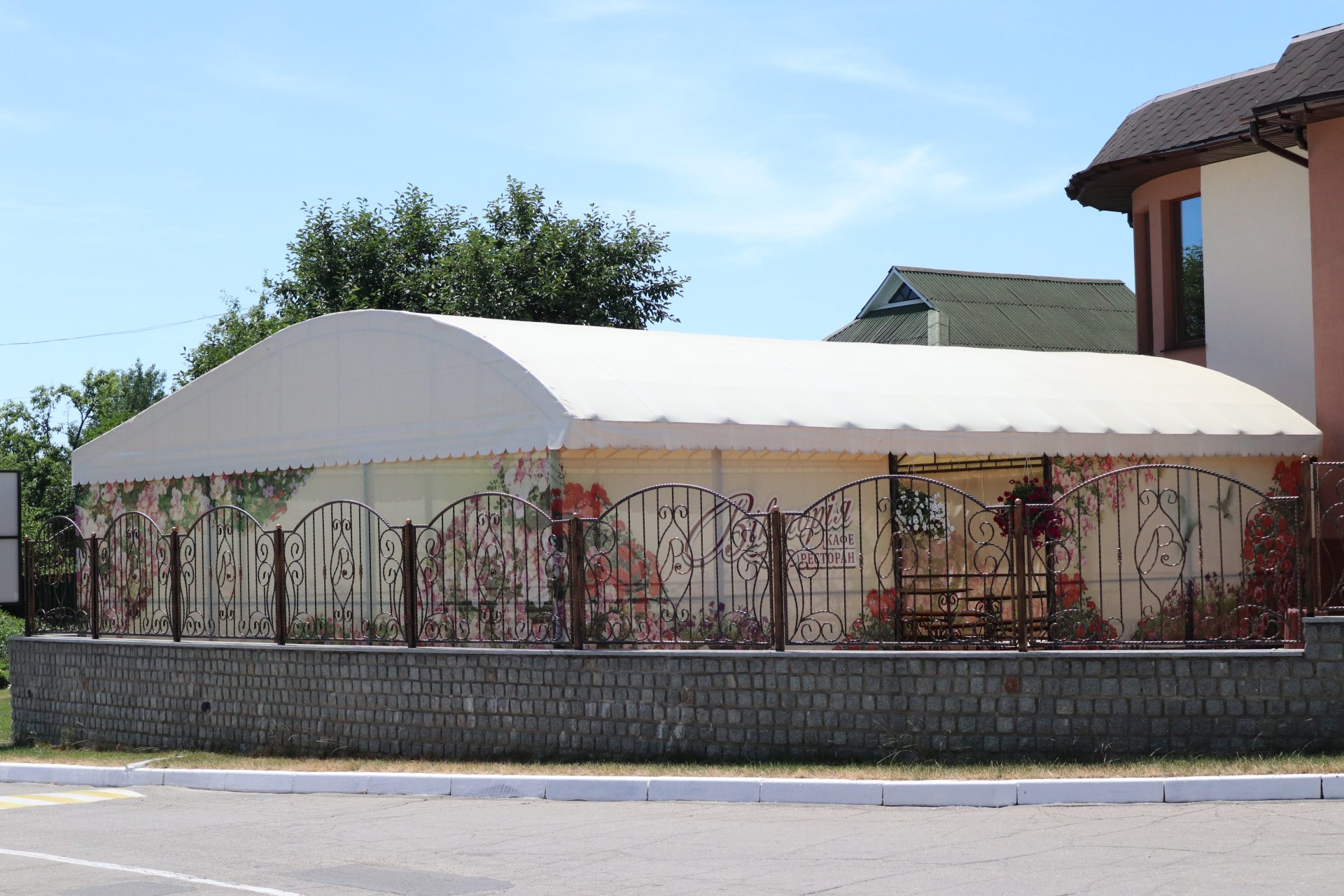 - У теплу, сонячну пору року (пізня весна, літо або рання осінь) краще використовувати наметову тканину. Це зробить заклад комфортнішим, додасть йому домашнього затишку. Тент має вологовідштовхувальні властивості, тому можна не боятися намочити гостей. Складнощів при монтажі не виникає: матеріал легкий, повітряний. Найчастіше клієнт може сам натягнути тент і зняти його, коли буде потрібно, без будь-яких проблем.